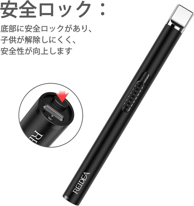 このREIDEA電子ライターは、重量33g、サイズは19.7×3.7×1.7cmとコンパクト設計。安全スイッチ付きで10秒自動消火機能があります。
