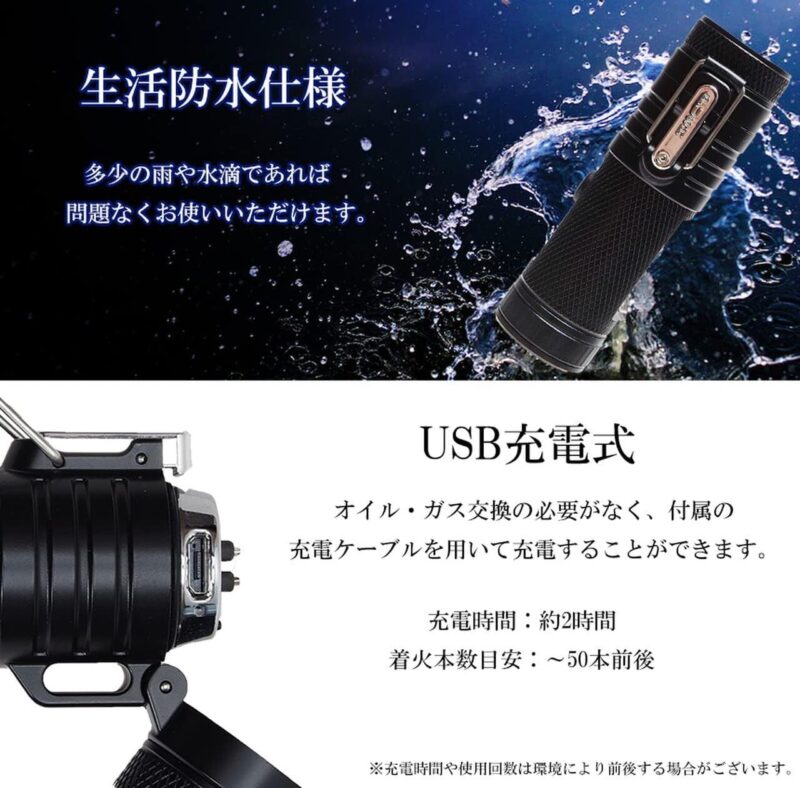今回紹介する商品の中で唯一IP56防水仕様で雨風に強く、アウトドアに最適。LEDライト機能も搭載し、1回充電で50〜100回使用可能。キャンプ、お線香、固形燃料の着火など多用途に活躍します。